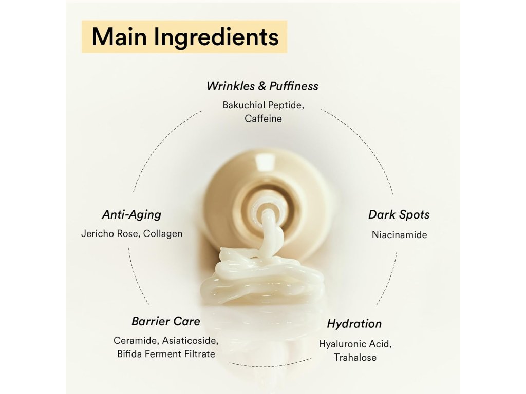 | Složení: | Water, Glycerin, Niacinamide, Octyldodecanol, Caprylyl Methicone, Caprylic/Capric Triglyceride, Pentaerythrityl Tetraethylhexanoate, Pentylene Glycol, Polyglyceryl-3 Methylglucose Distearate, Behenyl Alcohol, Methylpropanediol, Polymethylsilsesquioxane, 1,2-Hexanediol, Anastatica Hierochuntica Extract, Collagen Extract, Panthenol, Macadamia Integrifolia Seed Oil, Mangifera Indica (Mango) Seed Butter, Lactobacillus Ferment, Hippophae Rhamnoides Oil, Sodium Hyaluronate, Macadamia Ternifolia Seed Oil, Bifida Ferment Filtrate, Cetearyl Olivate, Hydroxyethyl Acrylate/Sodium Acryloyldimethyl Taurate Copolymer, Sorbitan Olivate, Glyceryl Stearate, Polyglyceryl-3 Distearate, Ammonium Acryloyldimethyltaurate/VP Copolymer, Bis-Diglyceryl Polyacyladipate-2, Caprylyl Glycol, Cetearyl Glucoside, Squalane, Ethylhexylglycerin, Dipotassium Glycyrrhizate, Sorbitan Isostearate, Adenosine, Allantoin, Glyceryl Stearate Citrate, Trisodium Ethylenediamine Disuccinate, Hydrogenated Lecithin, Ceramide NP, Tocopherol, Bakuchiol, Trehalose, Dipropylene Glycol, Butylene Glycol, Polyglyceryl-10 Laurate, Phosphatidylcholine, Asiaticoside, Phytosphingosine, Asiatic Acid, Glycolipids, Madecassic Acid, Palmitoyl Tripeptide-5, Sorbitol, Cetearyl Alcohol, Stearyl Alcohol, Xanthan Gum, Caffeine |