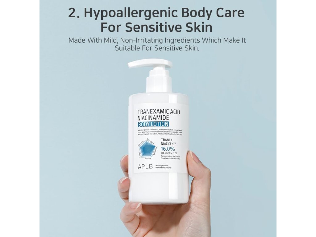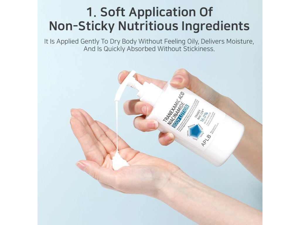 APLB – Tělové mléko s kyselinou tranexamovou a niacinamidem je perfektní volbou pro ty, kteří chtějí rozjasnit svou pokožku, sjednotit její tón a dopřát jí viditelně vyhlazený vzhled.