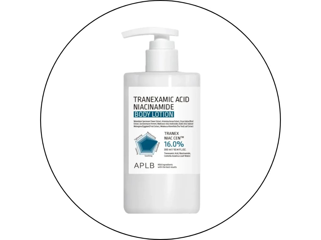 APLB – Tranexamic Acid Niacinamide Body Lotion je lehké, ale vysoce účinné tělové mléko určené pro rozjasnění pokožky, sjednocení tónu a hydrataci. Obsahuje kyselinu tranexamovou a niacinamid, které pomáhají redukovat pigmentové skvrny, zlepšovat texturu pokožky a posilovat její bariéru.