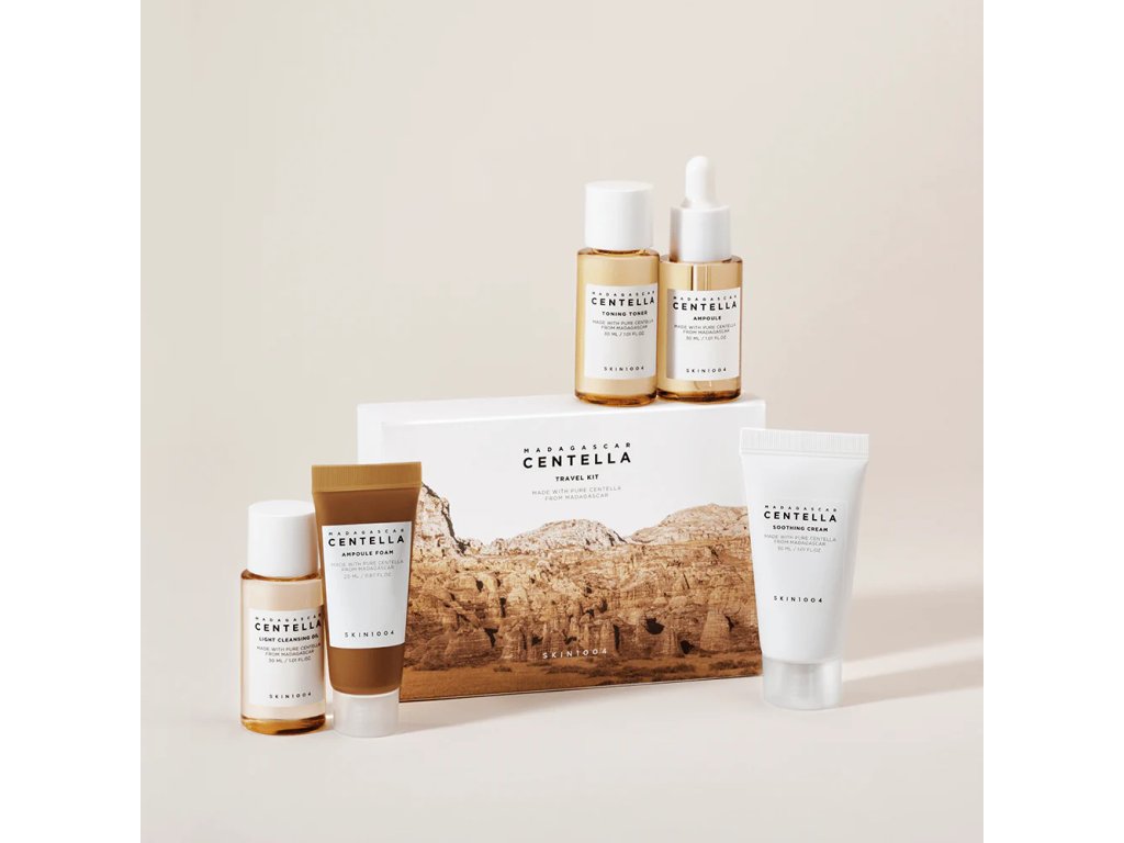 SKIN1004 Madagascar Centella Travel Kit je praktická cestovní sada péče o pleť s extraktem z centelly asiatica. Produkty v sadě pomáhají zklidnit, hydratovat a regenerovat pokožku, ideální pro citlivou nebo podrážděnou pleť během cestování.