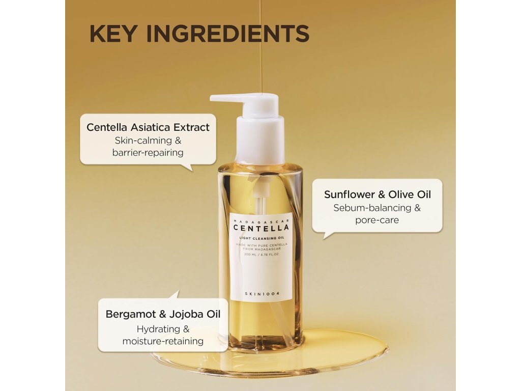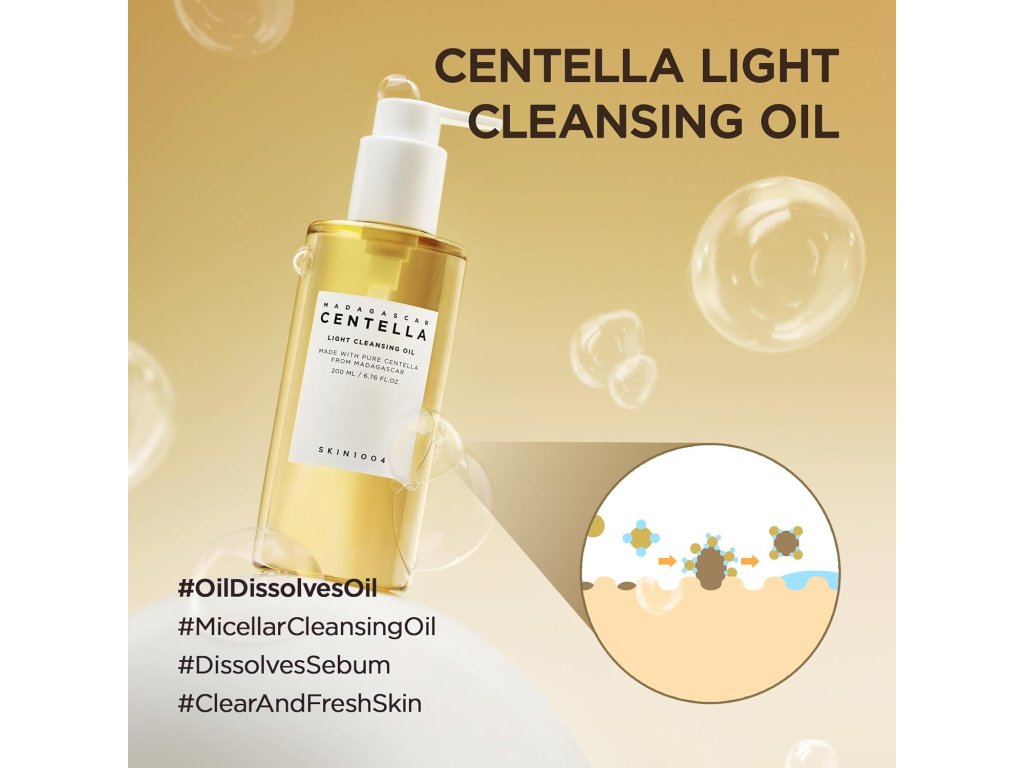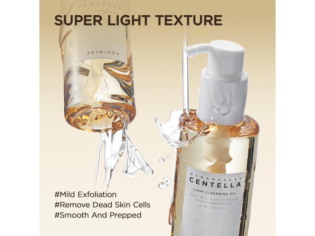 SKIN1004 Madagascar Centella Light Cleansing Oil je lehký a účinný čisticí olej, navržený pro šetrné a důkladné čištění pleti. Tento olej obsahuje extrakt z Centella Asiatica, který má zklidňující vlastnosti a přispívá k obnově pleti. Je ideální pro odstranění make-upu a nečistot, aniž by pleť zanechával mastnou nebo podrážděnou. Jeho jemná textura se snadno emulguje s vodou, čímž se přetváří na mléčnou konzistenci, která zajišťuje pohodlné a efektivní čištění.